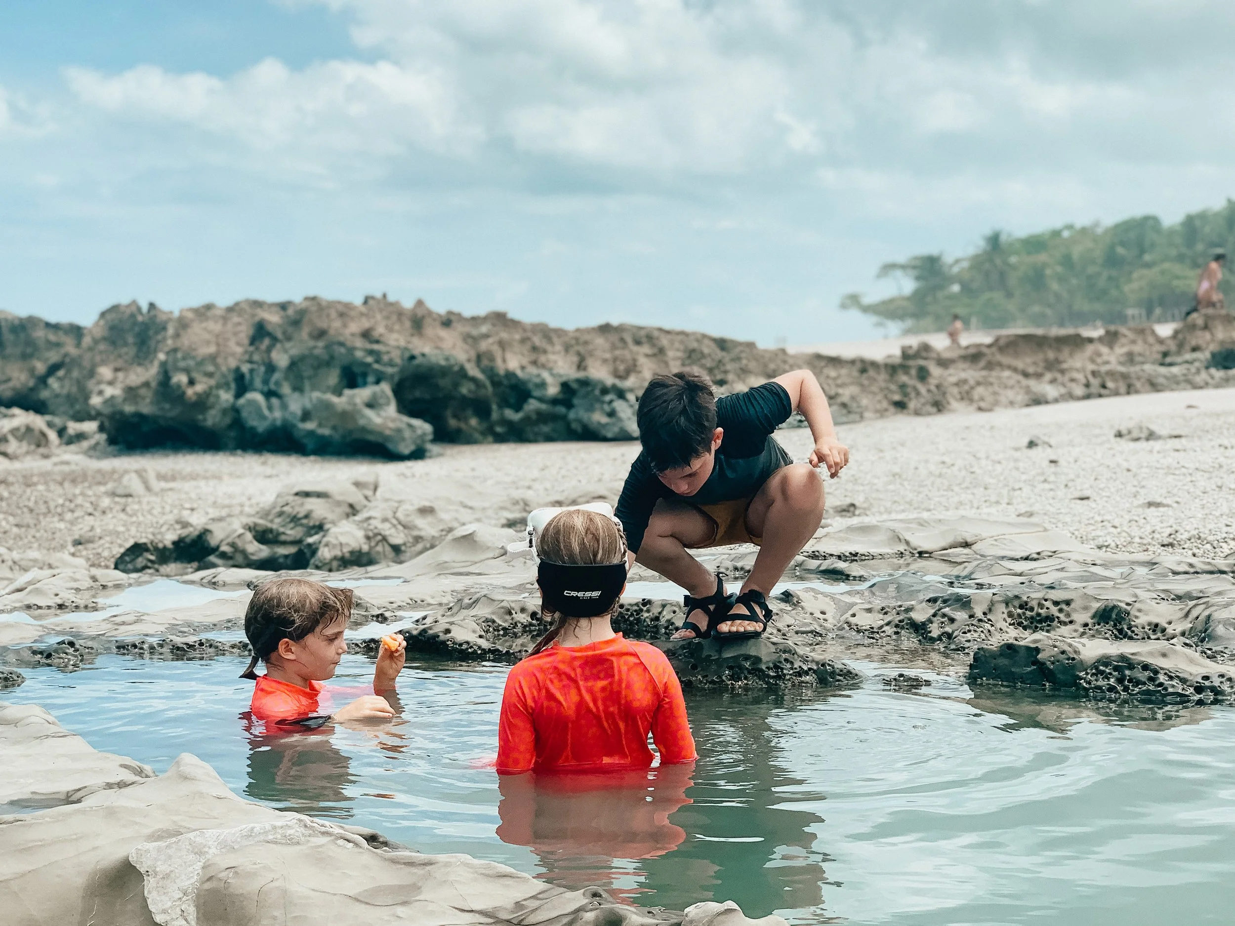 At low tide, tidepools abound up and down the entire coast - from Playa Suecos (Secret Beach) and Playa Mar Azul near Malpais to the olympic sized natural swimming pool just north of Playa Santa Teresa and Playa Manzanillo beyond that. The tidepools are a whole vibe. Deep enough for snorkeling and perfectly-sized for lounging as if in your own personal sized hot tub, they entertained our kids for hours upon hours. Visiting the tidepools was one of our favorite activities because the kids could swim and search for shells and sea life, and I could relax knowing they were not going to get caught in a riptide or pounded by a wave. Just watch out for the crabs and urchins!